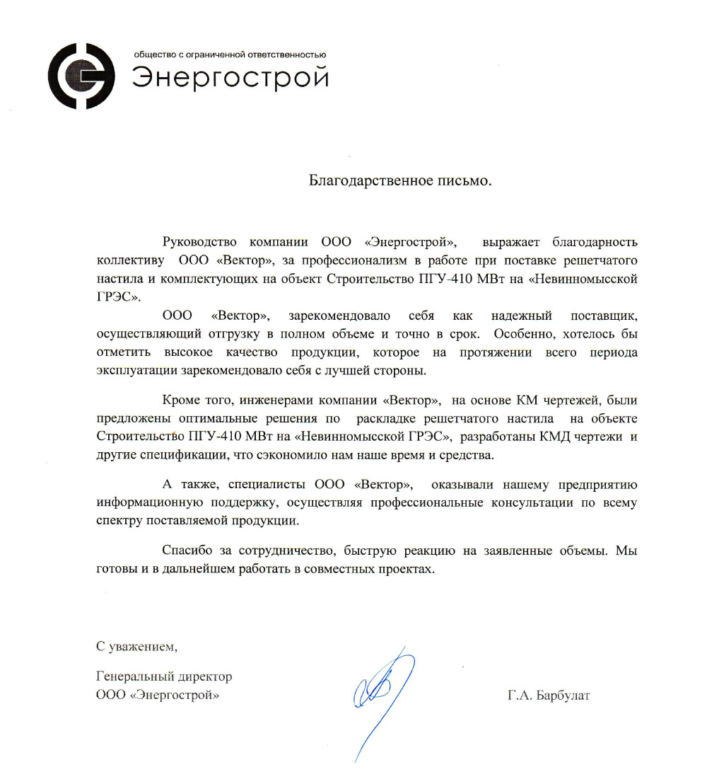 Благодарственное письмо Генерального директора ООО «Энергострой» Г.А. Барбулата